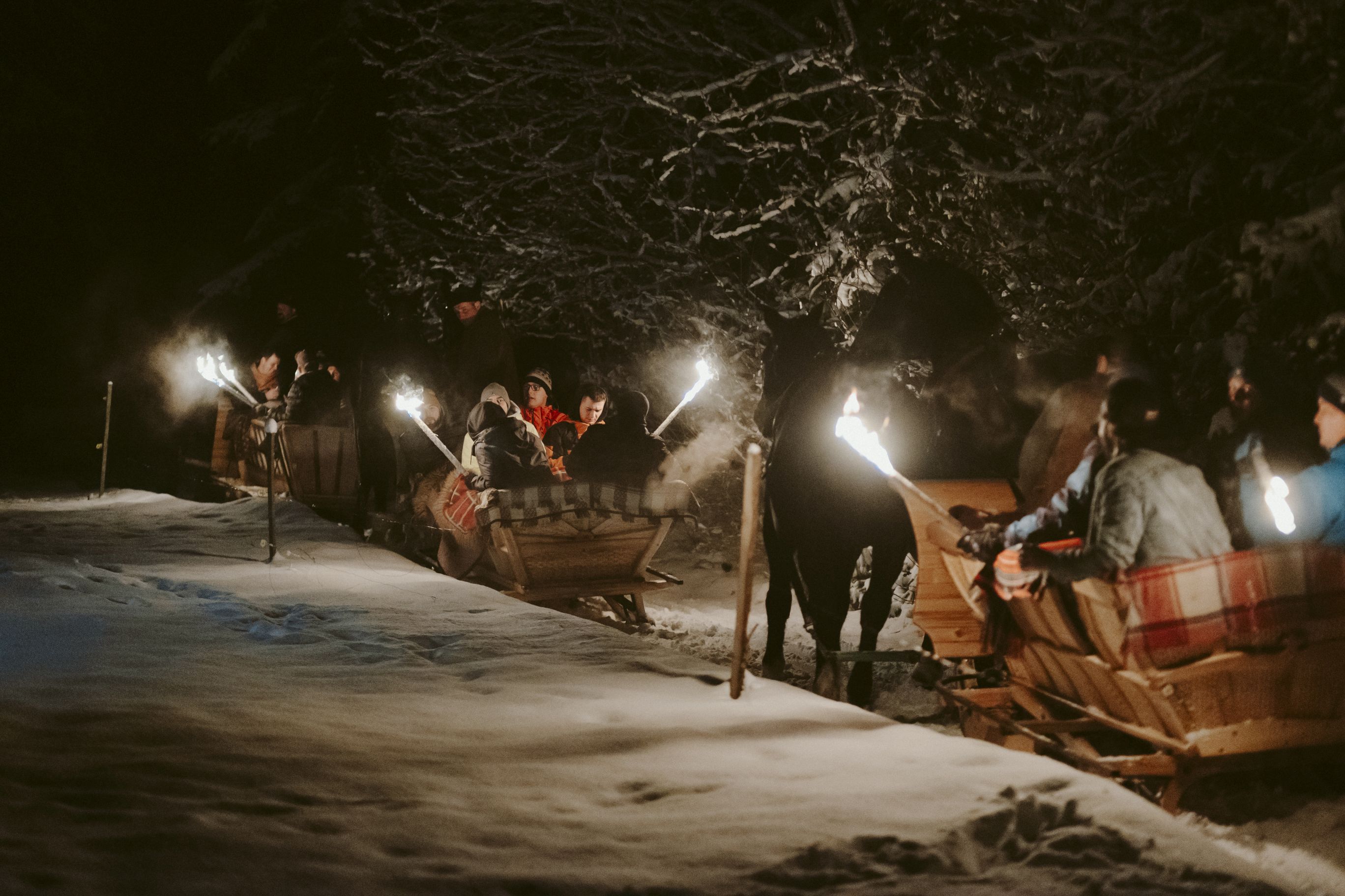 → 21:00 - Rozpoczęcie kuligu O godzinie 21:00 wsiadamy do tradycyjnych, drewnianych sań ciągniętych przez konie i wyruszamy w magiczną podróż przez zaśnieżone tereny Podhala. Przejażdżka po malowniczych trasach pozwoli poczuć klimat zimowej nocy w Tatrach, z bajkową scenerią gór i ciszą lasów.